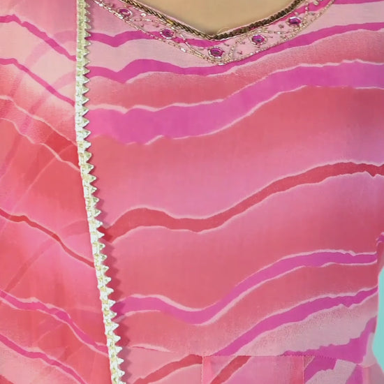 Add our Baby Pink Leheriya Handmade Suit Set. This beautiful ensemble features a soft pink baby coat with delicate Leheriya patterns and intricate handmade details. The soft colors and elegant design make it sophisticated and feminine, perfect for any special occasion. The set includes a compact bottom, ensuring a polished and proportionate look. Made from high quality georgette fabric for comfort and style, this suit set comes in a range of sizes and can be useful for family celebrations.