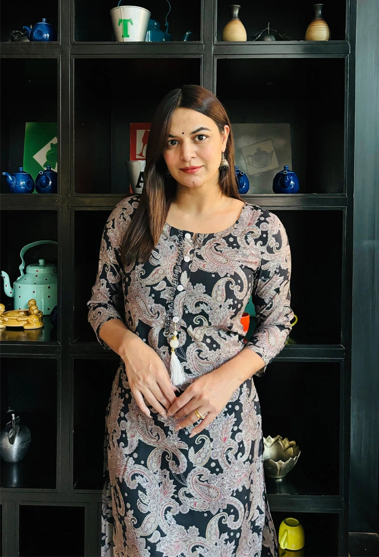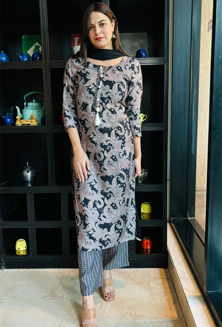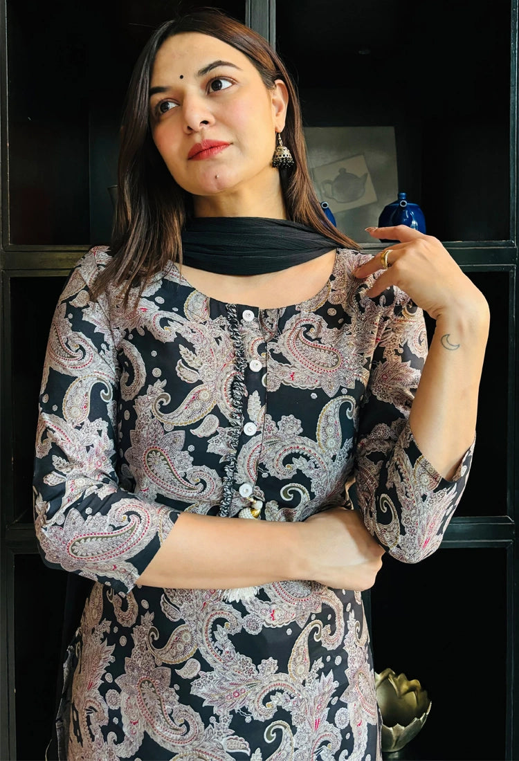The Black Printed Muslin Suit Set is a sleek and modern suit made of black muslin fabric embellished with intricate prints. The set usually includes a sleek curved A line kurta, with stripes pants and a black dupatta. The muslin fabric is lightweight and breathable, making it soft and easy to move around. The sleek black printed base adds a modern twist to traditional design, making this fitted suit appropriate for a variety of occasions, from casual events to informal gatherings.