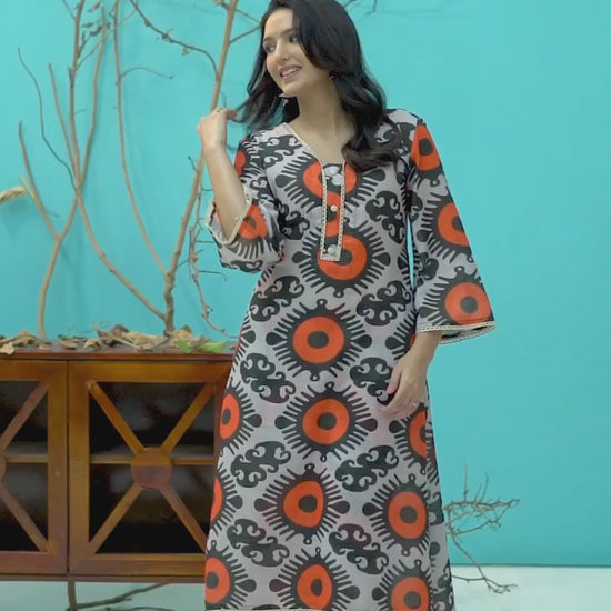 Make a bold statement with our Black-Orange Fish-Cut Kurta Pants Set. This stunning dress features an eye-catching orange black fish cut that adds a modern flair. Paired with matching zig zag stripes pants, this set offers a sophisticated yet edgy look that is perfect for special occasions or stylish gatherings. The combination of unique cuts and vibrant colors creates a unique look, ensuring that you turn heads wherever you go.