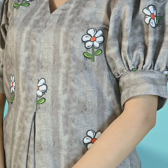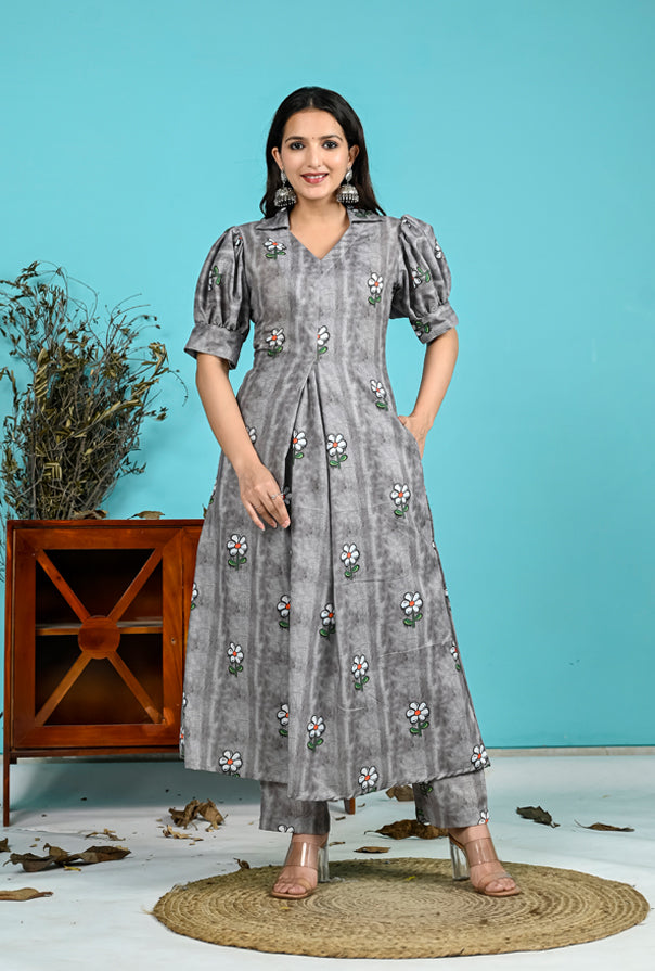 Find an effortless style with our Gray Printed Co-Ord Set with puff sleeves. This chic ensemble features a sleek gray fabric embellished with contemporary prints, giving it a modern and elegant look. The set includes a matching top and bottom, designed for blending and flexibility. Made from premium cotton, it is comfortable and durable for everyday wear.
