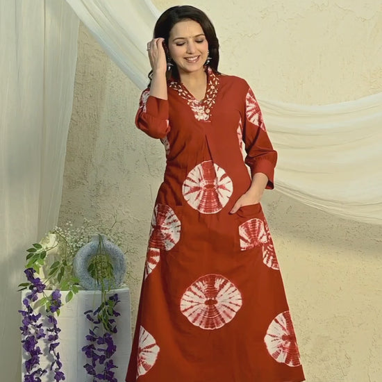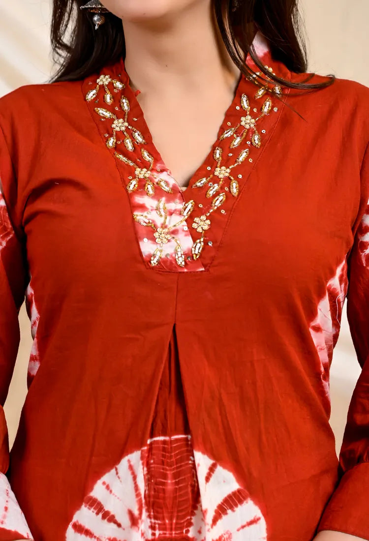Make a bold statement with our Maroon Rust Tie-Dye Kurta with Handwork & Pants Set. This eye-catching ensemble features an elegant maroon rust hue kurta, enhanced with artistic packaging patterns and delicate handmade details. Paired with white pant, this set combines a unique, warm look with traditional craftsmanship.