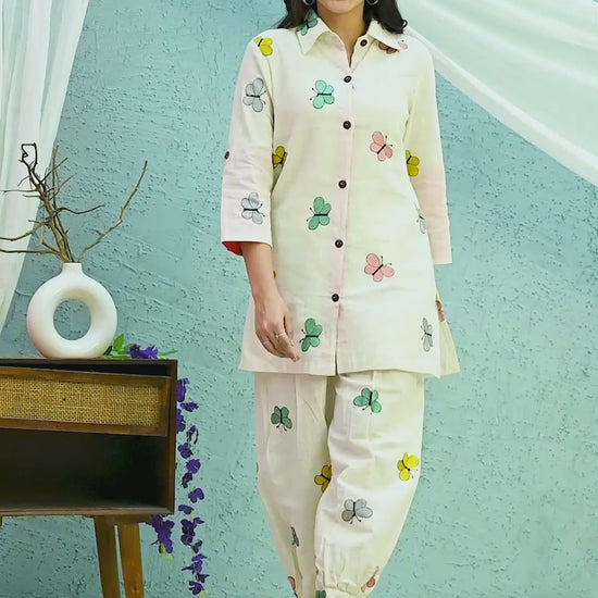 Elevate your style with our Off-White Butterfly Embroidered Co-Ord Set. This beautiful outfit features a delicate white fabric decorated with delicate butterfly embroidery with afgaan pant, adding a touch of whimsy and sophistication. The set includes a matching top and bottom, designed for a seamless, coordinated look that’s perfect for casual outings and special occasions alike.