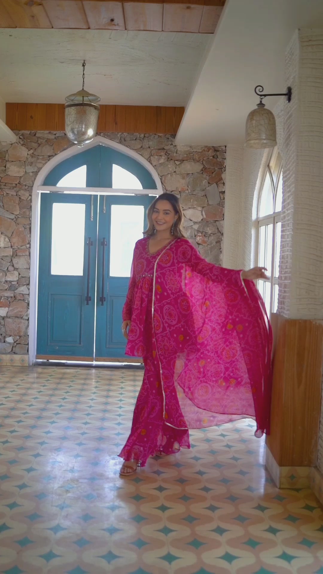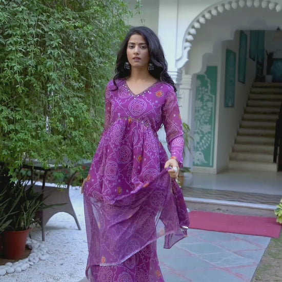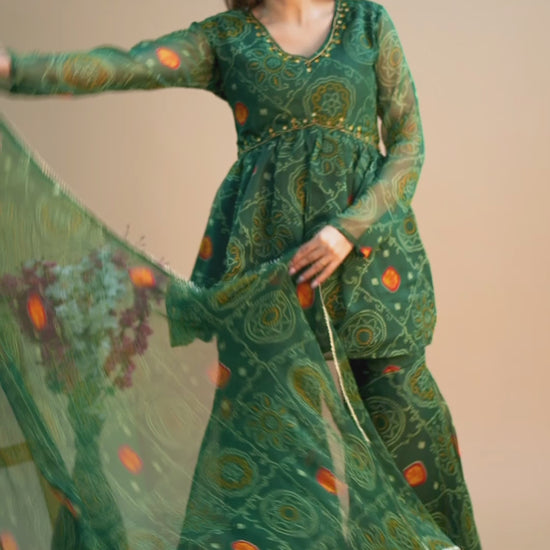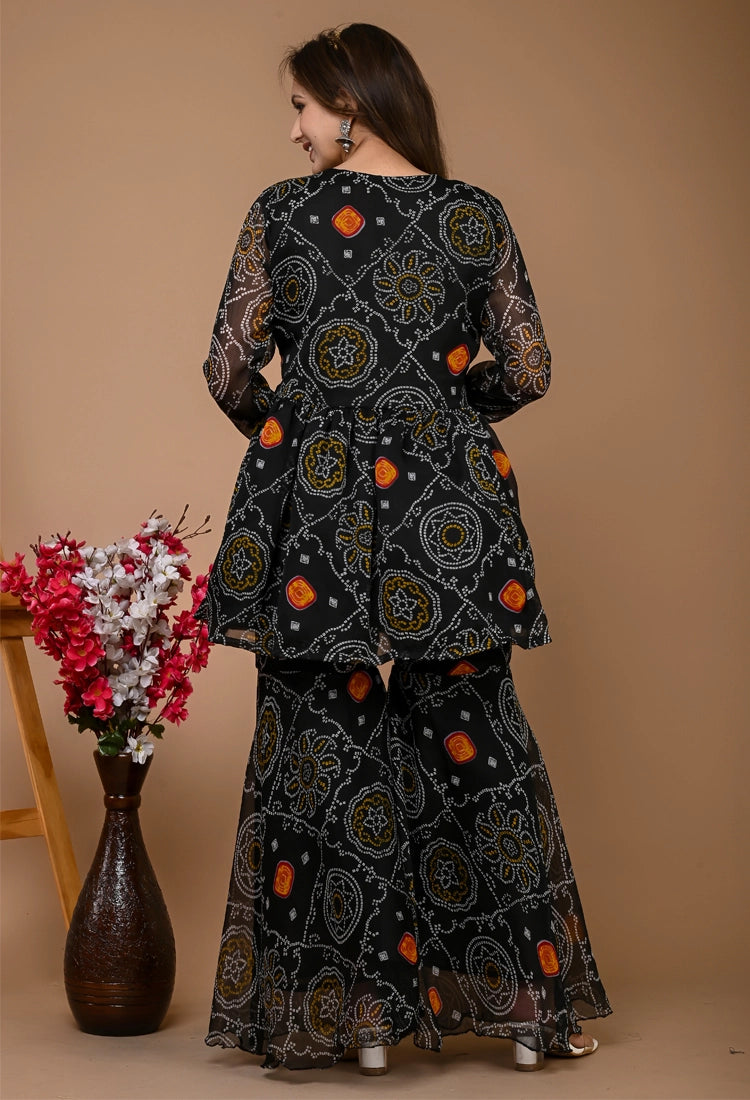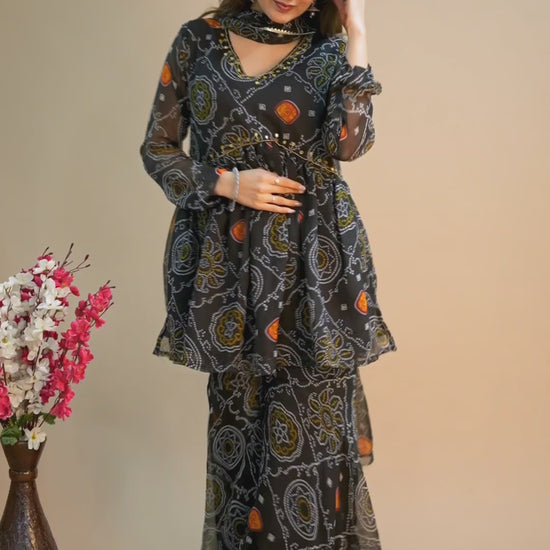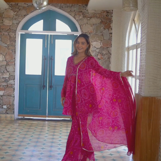 The Bandhani Sharara Suit Set is a vibrant and elegant ensemble that reflects traditional Indian art. It includes a flowing sharara with a matching peplum top adorned with an intricate Bandhani print. The bandhani technique creates unique, colourful patterns on the canvas, complimented with bold and eye-catching handwork. The set usually comes with a coordinating dupatta, to add a touch of sophistication and complete the look. Perfect for celebrations or festive events.