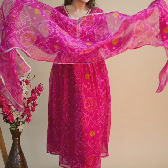 Pink Bandhani Chiffon Alia Cut Suit Set is a beautiful and sophisticated traditional bandhani digital pattern. The dress is made from a chiffon fabric, which provides beautiful coverage and a light and flowing fit. The Alia cut has a sleek, tailored design of unique quality, combining modern tailoring with vintage elegance. The pink bandhani pattern adds sparkle, making this set ideal for special occasions or celebrations where you want to stand out with grace and style.