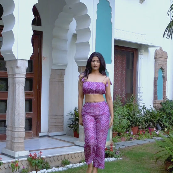 Wine Bandhani Crop Top with Shirt and Pants Set is a stylish and beautiful ensemble with traditional bandhani digital pattern in a lovely wine color. The crop top displays vibrant bandhani patterns, adding a touch of cultural charm. Paired with a one-piece for a layered look and matching pants for a one-piece. Made from high quality fabric, this set offers both comfort and sophistication, making it perfect for festivals or special events where a blend of traditional and contemporary style is wanted.