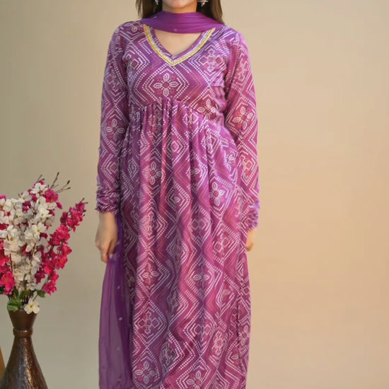 The Wine Bandhani Chinnon Alia Cut Suit is a sophisticated and elegant suit that blends traditional and contemporary styles. Made from a chinnon fabric, it features a deep bandhani digital pattern that is as deep as sweet wine, adding warm tones and traditional style. The alia cut gives a sleek, refined silhouette with a sleek flare, enhancing the flowy and refined look of the suit set. Perfect for formal celebrations or events, this suit set combines luxurious fabric with sophisticated design to create a sophisticated and eye-catching ensemble.